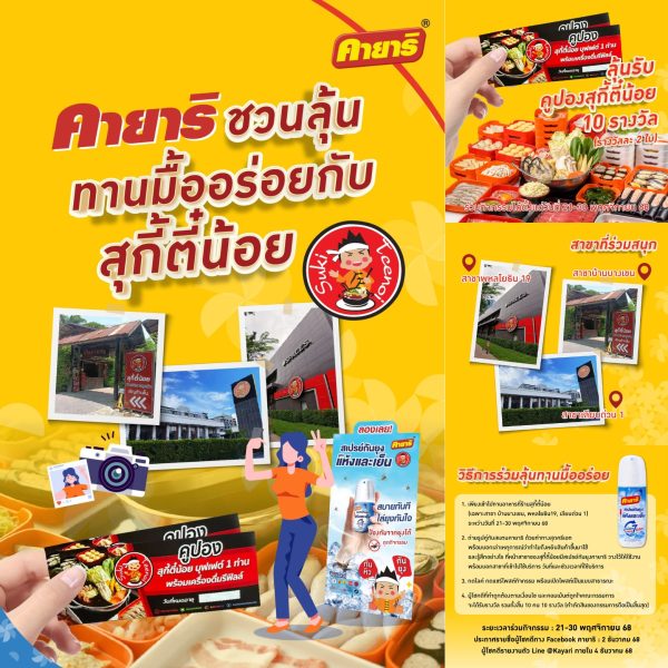 คายาริ ชวนลุ้นทานมื้ออร่อย ที่สุกี้ตี๋น้อย . ชวนพี่ๆแฟนพันธุ์แท้ สุกี้ตี๋น้อย มาร่วมสนุกลุ้นคูปองทานอาหารมื้ออร่อยที่ “สุกี้ตี๋น้อย” จำนวน 10 รางวัล เ