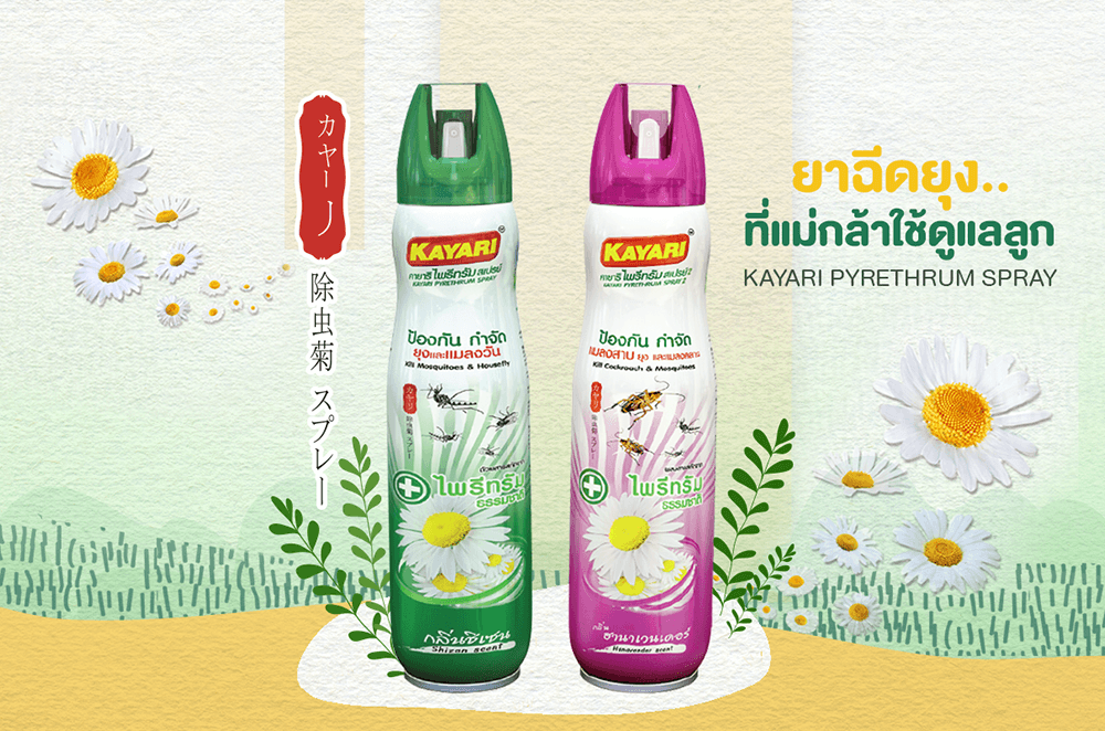 คายาริไพรีทรัมสเปรย์ กลิ่นชิเซน สเปรย์กำจัดยุงและแมลงในบ้านเรือน หนึ่งเดียวที่ใช้สารสกัดจากดอกไพรีทรัมเป็นส่วนประกอบหลัก โดดเด่นด้วยความเป็นธรรมชาติ ทรงประสิทธิภาพในการกำจัดยุง แมลงวัน และแมลงบินสูง อีกทั้งยังมีความพิเศษในการย่อยสลายตัวได้เร็วกว่ายากำจัดยุงสูตรอื่นถึง 50 เท่า จึงไม่ทิ้งสารตกค้าง ไม่ก่อให้เกิดการสะสมในร่างกายหรือบริเวณพื้นที่ที่ใช้งาน อ่อนโยนต่อผู้ใช้งานทุกครัวเรือน